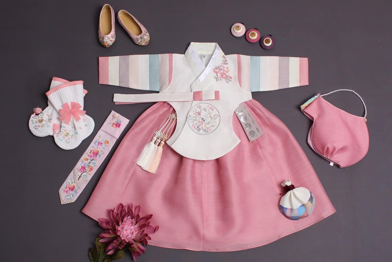 The baby and sometimes even the parents wear hanbok, the traditional Korean clothing.