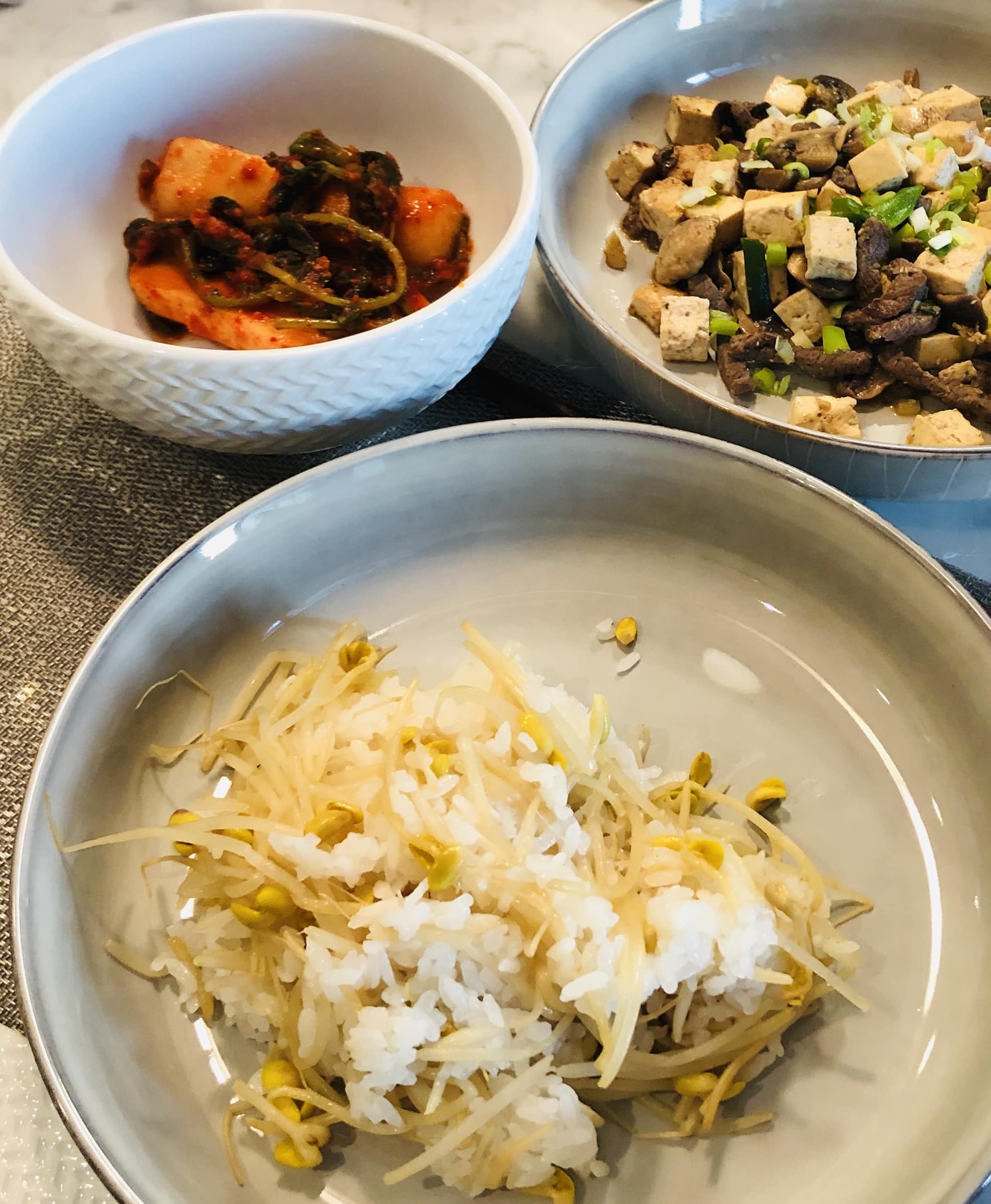 When the rice is done, gently fluff up the rice, evenly distributing the sprouts, meat and kimchi. Serve with the sauce on the side.